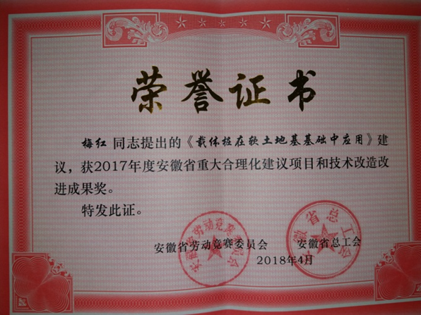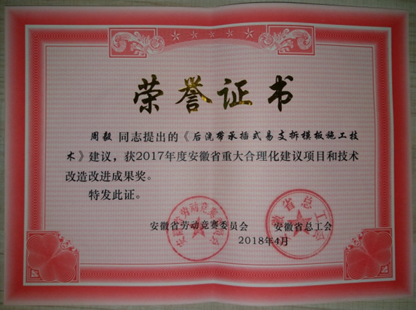 在日前召開的安徽省慶祝“五一”暨“當好主人翁、建功新時代”勞動競賽推進大會上,對獲得榮譽稱號的先進集體和先進個人進行了表彰頒獎。我公司技術(shù)質(zhì)量部主任周毅提出的《后澆帶承插式易支拆模板施工技術(shù)》和副主任梅紅提出的《載體樁在軟土地基基礎(chǔ)中應(yīng)用》建議,雙雙榮獲2017年度安徽省重大合理化建議項目和技術(shù)改造改進成果獎。