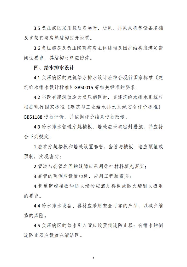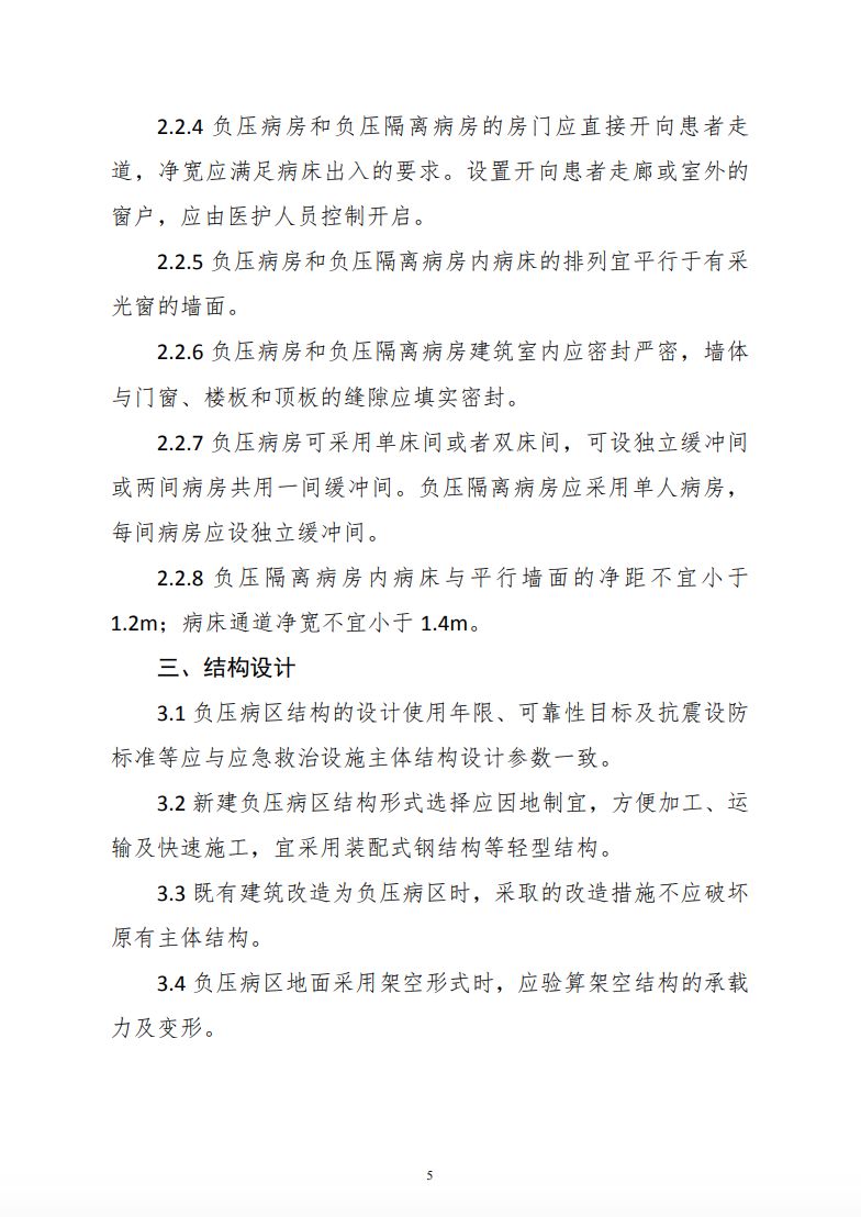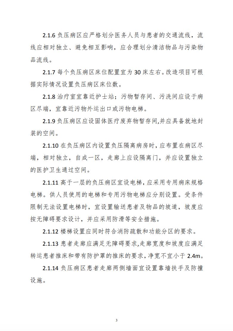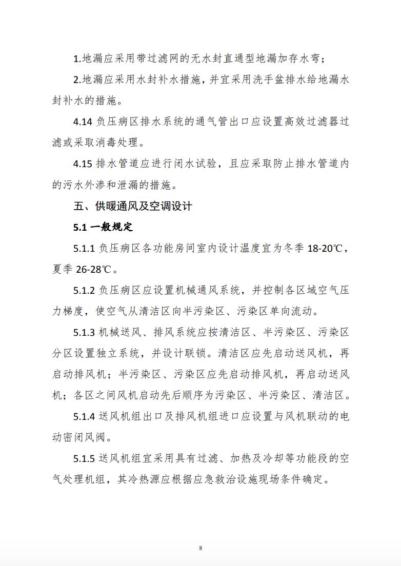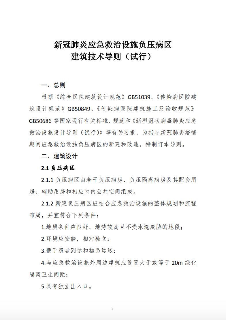 為進一步做好新冠肺炎疫情防控工作,加強新冠肺炎應急救治設施建設,國家衛健委辦公廳、住房和城鄉建設部辦公廳近日聯合印發《新冠肺炎應急救治設施負壓病區建筑技術導則(試行)》,供各地結合防疫工作和實際需要參考執行。導則包括建筑設計、結構設計、給水排水設計、供暖通風及空調設計、電氣及智能化設計、運行維護等8個方面。